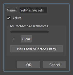 SourceMeshAssetIndices | The complete list of mesh asset indices meant to replace the current selection ones. "Pick From Selected Entity" helper will copy and replace all indices from the selected entity into the node. |