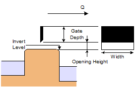 Sluice gates or penstocks are rectangular drop gates and may be used as the outflow control on storage tanks or ponds. They can also be set to a fixed opening. Sluice gates can be adjusted during the analysis to represent manual or automatic operation of the gate.