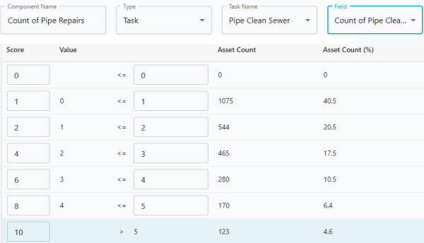 For example, if an asset has a high number of repairs associated to it, this may indicate that the asset is more prone to failure. So, you can create a Likelihood of Failure (LoF) risk component and assign higher scores for higher task counts.