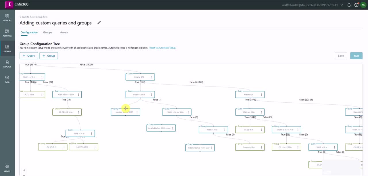 Configure asset groups by creating queries and arranging these into a tree structure. You can query any data you have available in Info360 Asset.