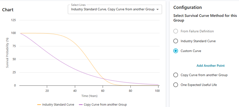- Custom Curve: Create your own curve by adding specific survival probability and age pairs to define the points. A Weibull distribution will be fitted to these points.