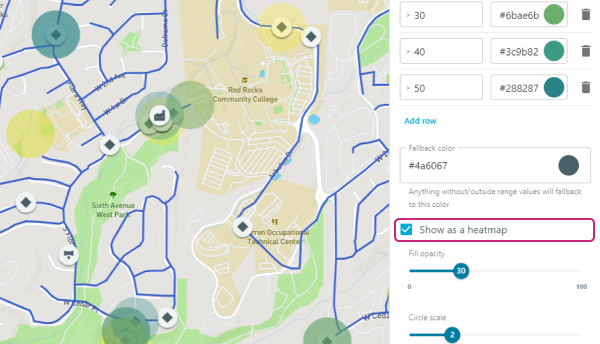 You can enable the Show as Heatmap option when configuring a map theme and setting up a color range for your sensors.