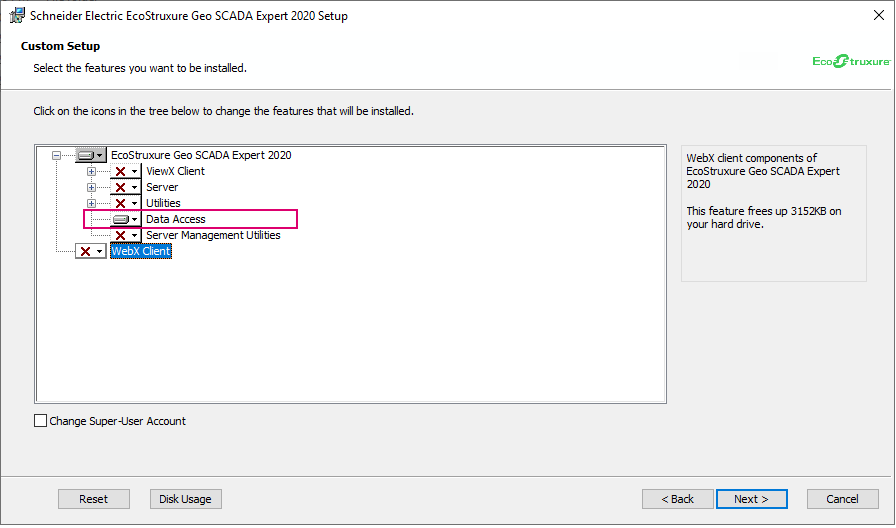 - Run the installer and when prompted, select Custom Setup and then deselect everything except Data Access and proceed with the installation.
