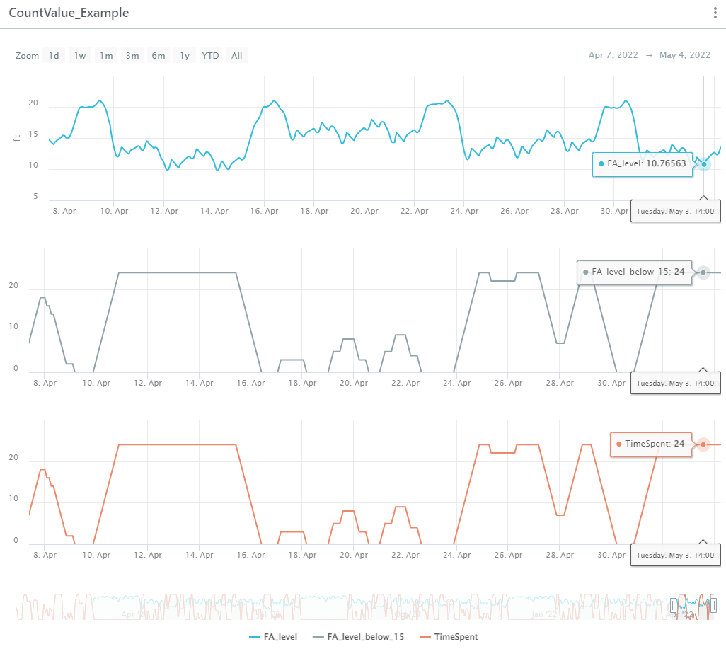 This chart shows a level sensor (FA_level), and a calculation of the amount of time (in hours) the level sensor has been below 15 feet (TimeSpent).