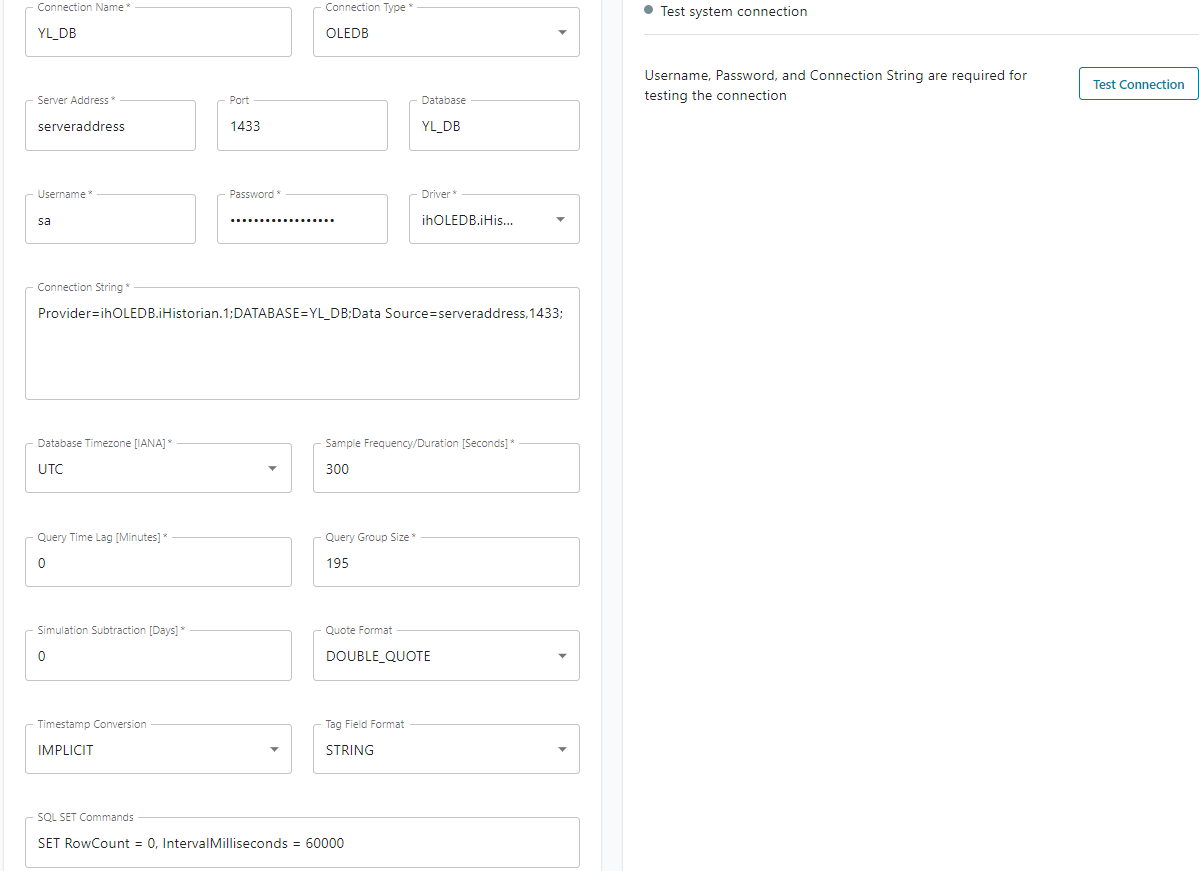 Note: You must have OLE DB connectivity in order to test the connection. The Test Connection button remotely triggers the Info360 Plant Data Connector to issue a test query against your historian/database using the details and credentials you entered, and reports a success or failure.