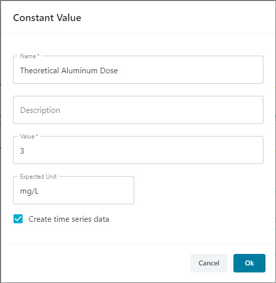 To configure the theoretical calculation, you can turn a Constant Value input node (e.g., theoretical aluminum dose) into a time series data stream and use this in your output expression.