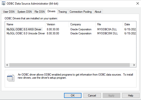 - Once the installation is complete, open the ODBC Data Source Administrator (64-bit) and check that you can see the MySQL drivers on the Drivers tab.