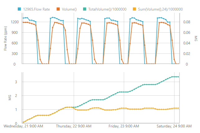 The following chart shows the flow rate from a pump station with several functions applied to view the volumes that are delivered.
