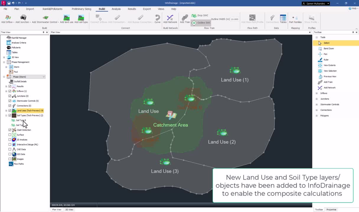 In this Tech Preview, we are introducing enhanced sub-catchment modelling capabilities through the addition of Land Use and Soil Type polygons. This feature allows you to incorporate detailed polygon attributes to refine hydrological calculations for each sub-catchment, providing a more accurate and spatially informed approach to drainage design.