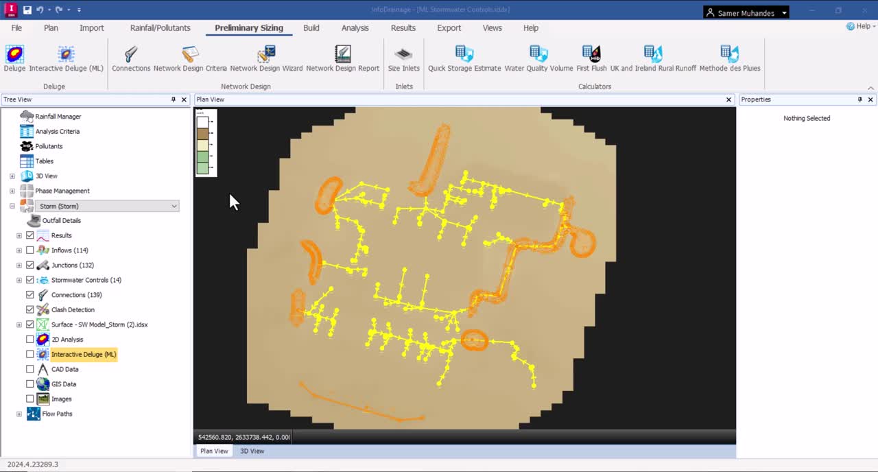 We are excited to introduce groundbreaking enhancements to our deluge analysis capabilities. One of the key advancements in InfoDrainage 2025.0 is the integration of user-defined ponds and swales into our machine learning-based flood mapping technology. In previous versions, our machine learning algorithms provided valuable insights into deluge flood patterns but were blind to the presence of user-introduced features such as ponds and swales.
