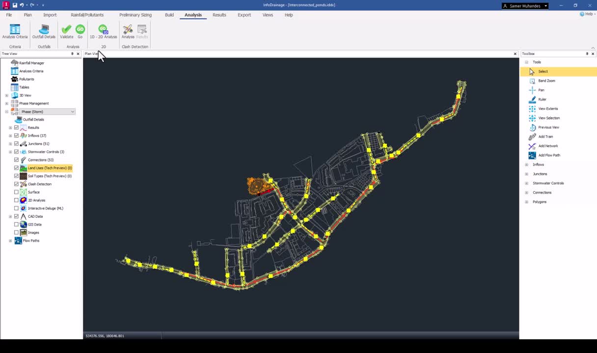 Pipes and Stormwater Controls: Whether it's a storage structure, swale, or rain garden, InfoDrainage can now identify any spatial conflicts between these stormwater control measures and your pipeline layout.
