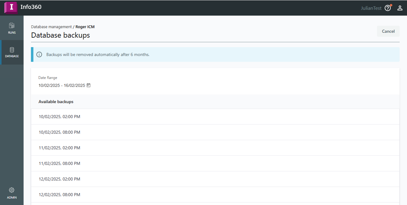 This page is displayed when you click a row in the Active or Deleted tab in the Data management page, and lists all the available backups for the selected database.