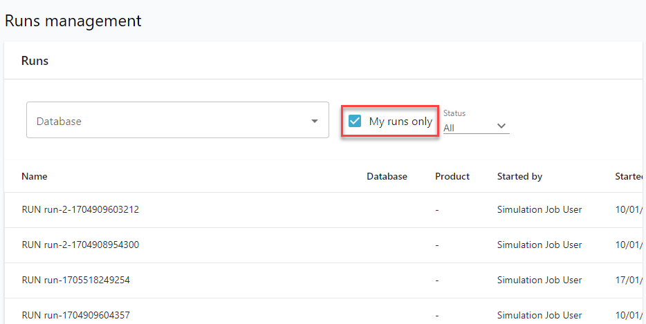 Runs management: This page is now displayed when you start Info360 Model Management. Previously, it was the Database management page. |