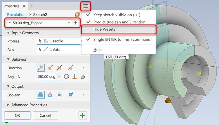 Extrude and Revolve: All property panel settings for Extrude and Revolve features are preserved in presets for easy reuse.