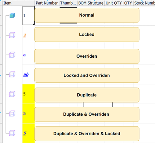 BOM item numbers have multiple display states to indicate the difference between normal, locked, overridden and duplicated states or combinations thereof.