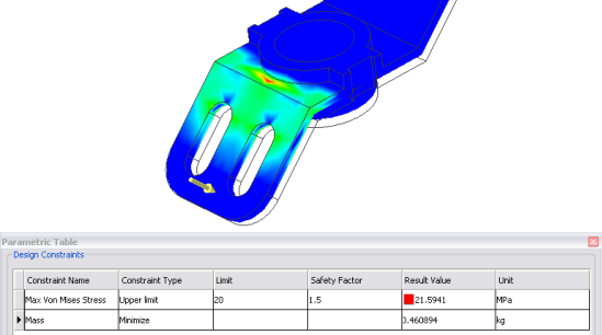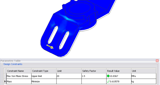 Then Specify the value and safety factor of the limit. change the status of another constraint to Minimize. The configuration updates and displays a result with the minimized values.