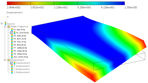 A modal analysis calculates the natural frequencies of vibration for the number of frequencies specified. It includes frequencies that correspond to rigid body movements. For example, in an unconstrained simulation, the first six modes occur at 0Hz, corresponding to the six rigid body movements. Design constraints can be geometry based or a frequency. For Modal Analysis, the default is Frequency 1