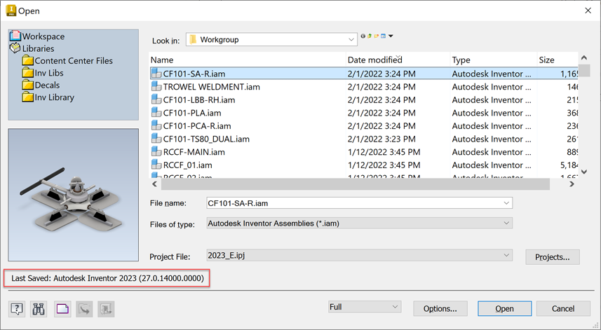 The browser displays the referenced newer file. Component nodes are different from Inventor native components.