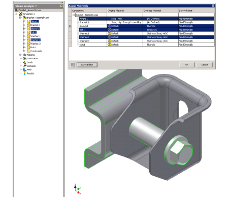 In each simulation, you can override the assigned material for a given part or assembly. The override occurs only for the specific simulation and does not affect the assembly model unless you promote changes to the model. When modeling components, if you plan to use simulation, use materials that are appropriate and defined.