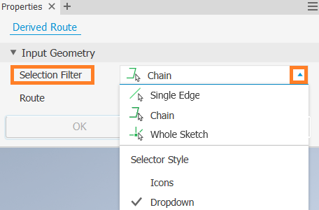 - You can change the selection method at any time before breaking the link between the derived route and the base sketch. All selected sketch elements are highlighted in cyan.
