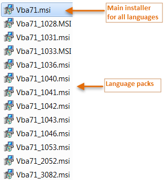 Vba71.msi is the main installer for all languages. The other installers are language packs. To identify the appropriate language pack for your language, refer to: https://msdn.microsoft.com/en-us/library/ms912047(v=winembedded.10).aspx If applicable, right-click on the appropriate installer, and select Install.