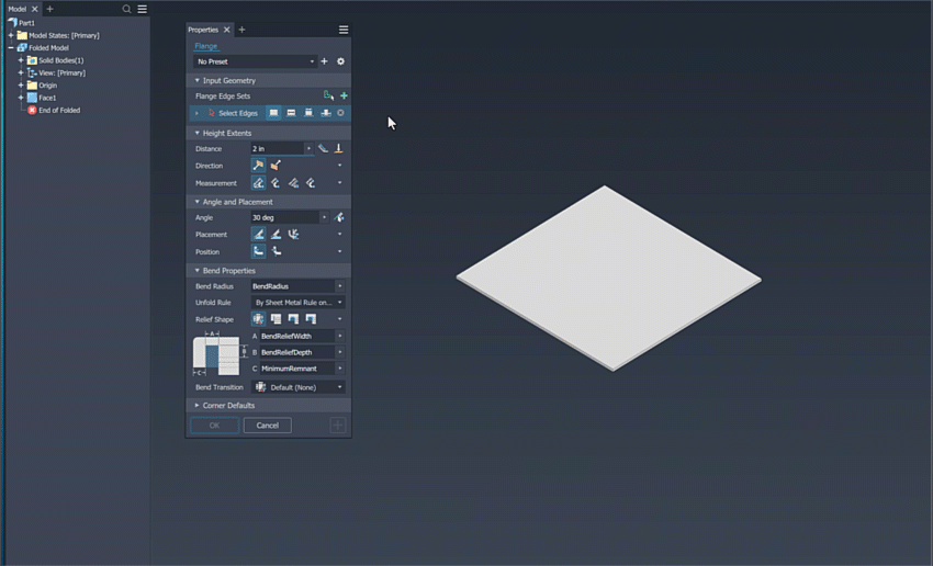 The following Sheet Metal commands have been modernized, incorporating the property panel interface and workflows. Quickly and easily create sheet metal flange, face, and cut features. Take advantage of the updated interface and workflows to improve your sheet metal tasks.