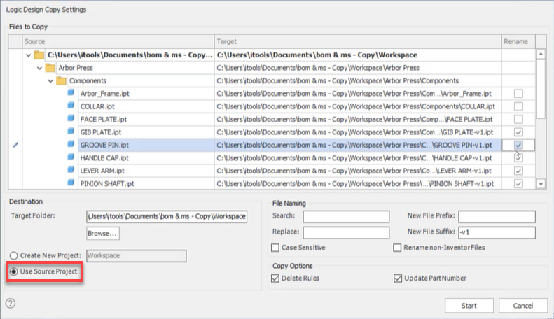 It is now possible to reuse files without copying them and creating a new project file. If the target folder is the same as the source folder, select the "Use Source Project" option in the iLogic Copy Design Settings dialog and specify the desired prefix or suffix, or the Search and Replace options to rename the files. Then uncheck the Rename option on the specific files that you don't want to rename.