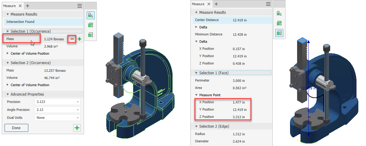 - In Assemblies, Mass is supported and included in measurements if part or component selection is specified.