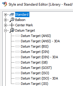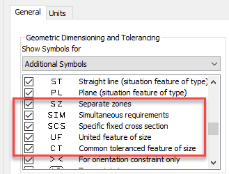 Additional identifiers were added to the Feature Control Frame style dialog to comply with ISO 5458, ISO 14405-1:2016, and ISO 1101 standards.