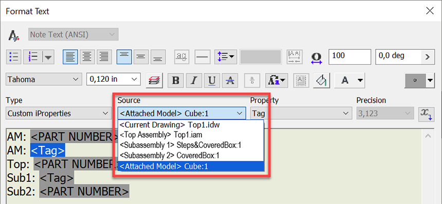 Leader text can now include standard iProperties, custom iProperties, and instance properties belonging to parents of the attached part.