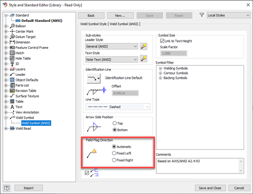 A new "Field Flag Direction" option is added to the Weld Symbol Style and Standard Editor dialog enabling you to set the direction of the field flag.