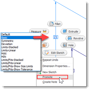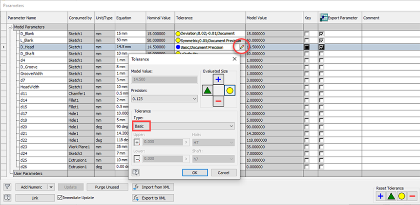 Basic tolerance: The Parameters Editor provides access to the Basic tolerance which can be promoted and synced with 3D annotations in the model and retrieved in drawings.