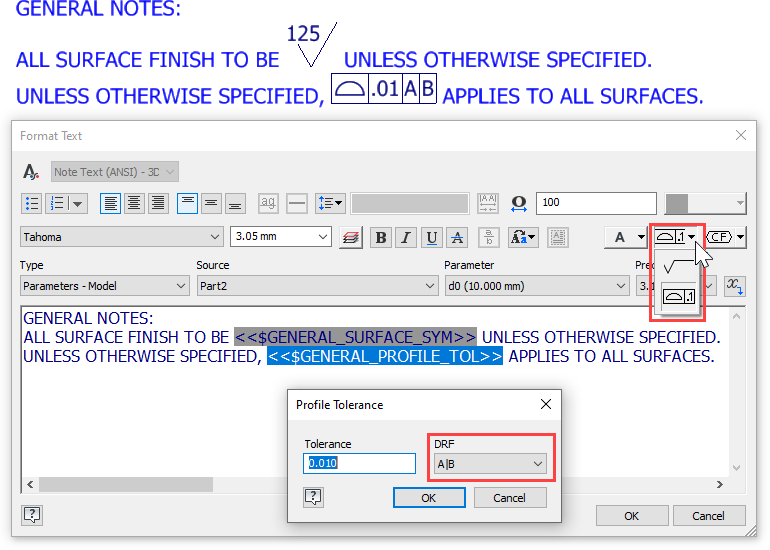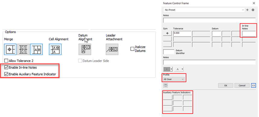 Feature Control Frame: The "All Over" symbol on the Feature Control Frame. Use the new "All Over" option in the Profile drop-down menu in the Feature Control Frame dialog.