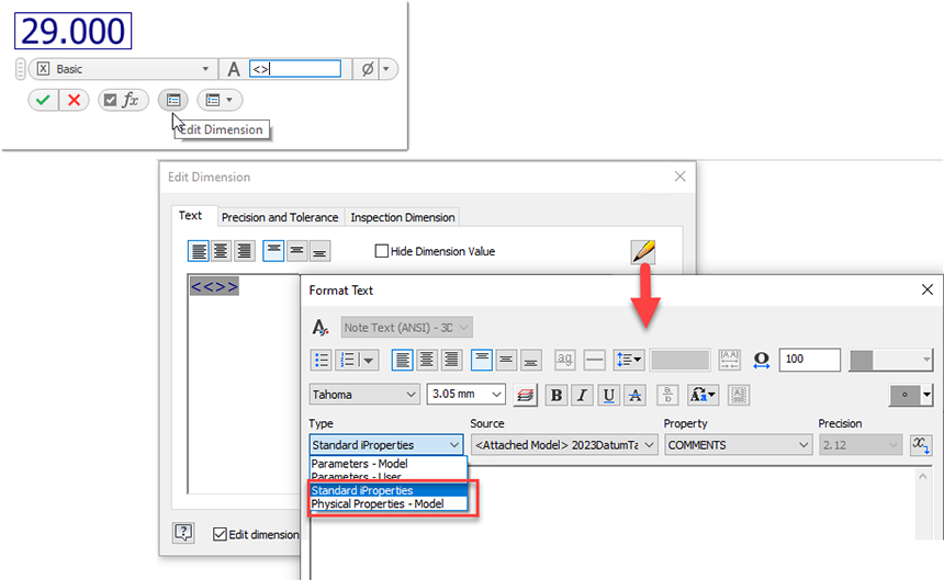 Model Sketch Text: Use Standard iProperties and Custom iProperties from the active model in Part sketch text.