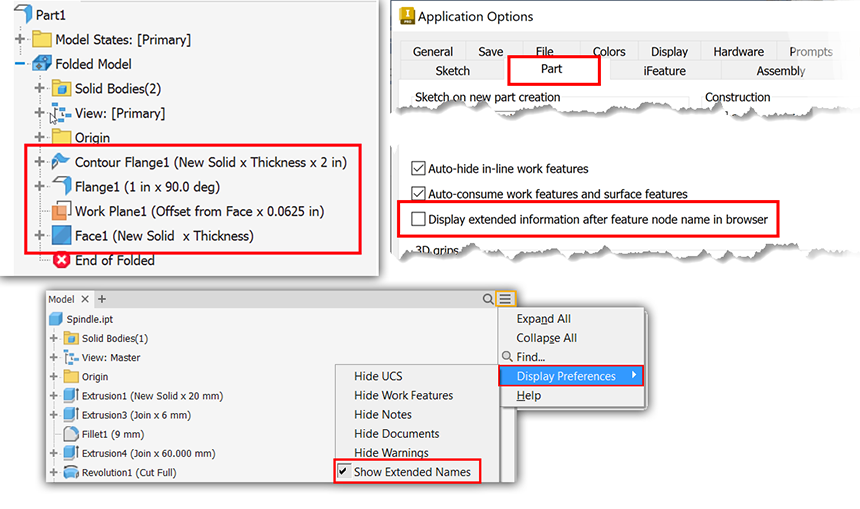 Sheet Metal: Extended browser information is available for sheet metal parts. The option can be activated from the Application Options > Part tab or from the browser node.
