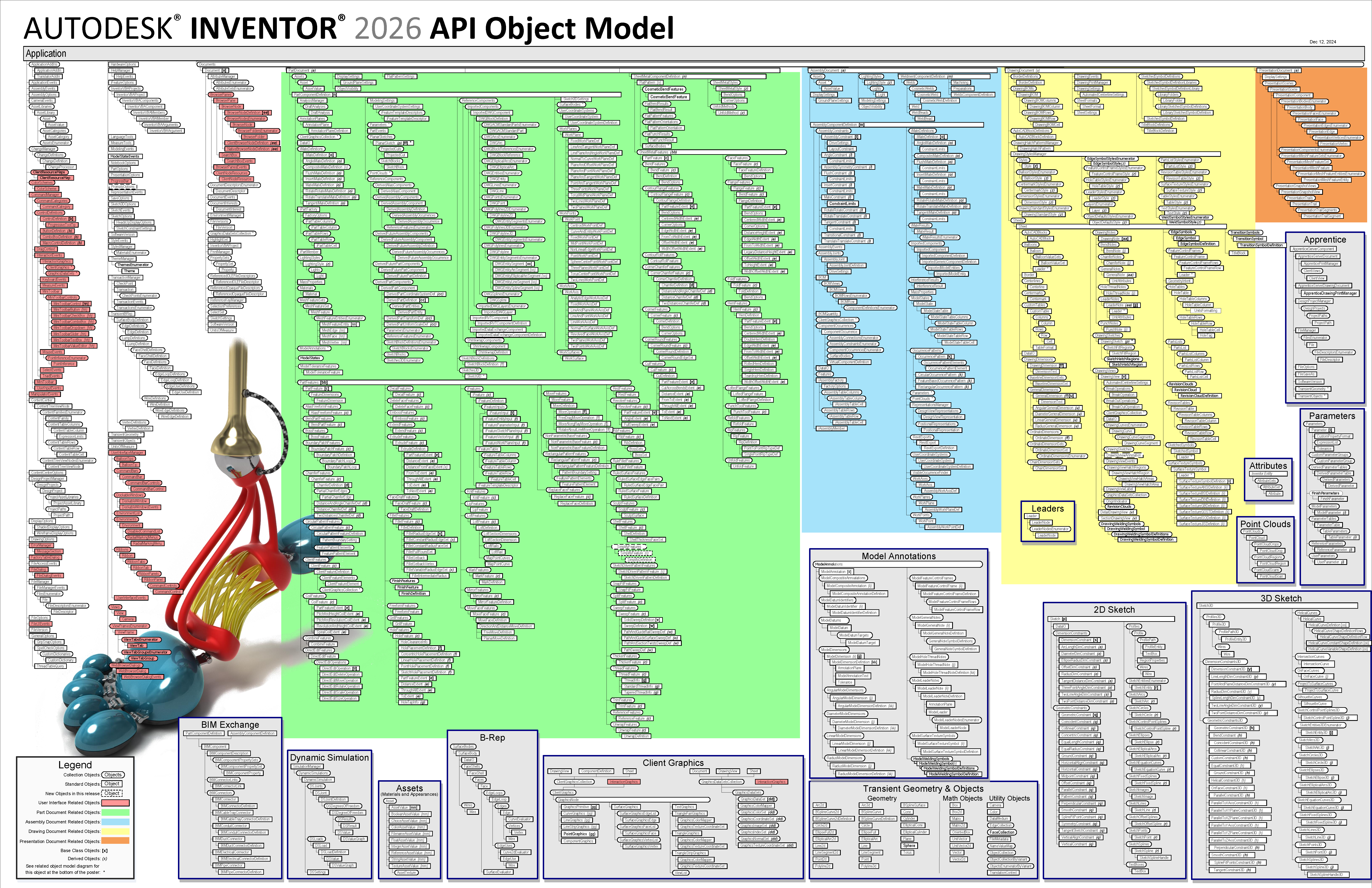 As discussed above, Inventor’s API is exposed as a set of objects. By gaining access to these objects through the API you can use their various methods, properties, and events to control and react to Inventor. Let’s look at how you access these objects. The first concept to understand before going further is the object model. The full Inventor object model is shown below. You can see that there are a lot of objects, but most programs will use only a small portion of them.