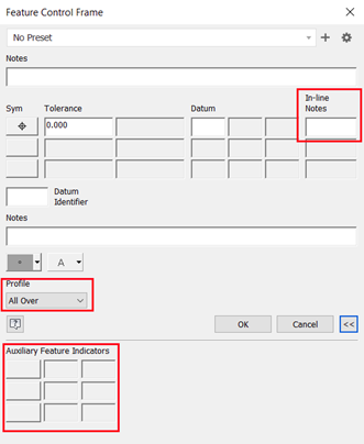 It is now possible to add the "All Over" symbol on the Feature Control Frame. Use the new "All Over" option in the Profile drop-down menu in the Feature Control Frame dialog.