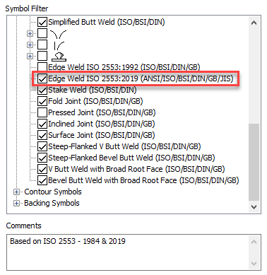 Edge Weld Symbols now uses the latest available ISO 2553-2019 standard. The symbol is added to the Style Editor and enabled by default for the following standards: ISO, DIN, ANSI, BSI, GB, JIS, GOST (only in weldment).