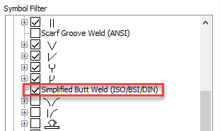 Simplified Butt Weld and Edge Weld Symbols now uses the latest available ISO 2553-2019 standard. The symbol is added to the Style Editor and enabled by default for the following standards: ISO, BSI, DIN, GOST (only in weldment). It is also available for the following standards but not enabled by default: ANSI, JIS, GB.