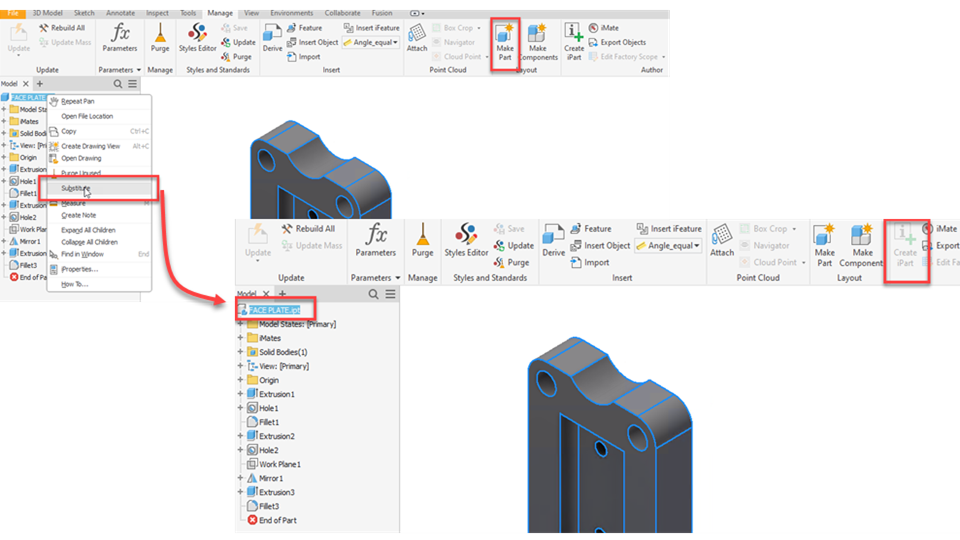 Use the "Substitute" option from the content menu in the Part Browser node. The Part Browser node reflects the status of the substitute part, and the "Create iPart" command is disabled.