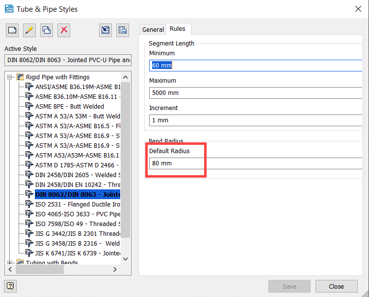 In the Tube & Pipe Styles dialog, the Default Radius edit field is now available for all Tube & Pipe styles. Default Bend Radius equals to 2* Nominal Diameter value. Changed value will be used for new custom bends. Existing routes with custom bends will be updated to reflect the new Bend Radius value.