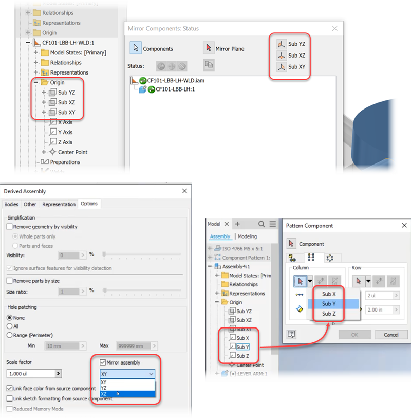 Custom names assigned to Origin work features are now recognized and populate the various dialogs used for commands such as Mirror Components, Pattern Component, and Derived Assembly.