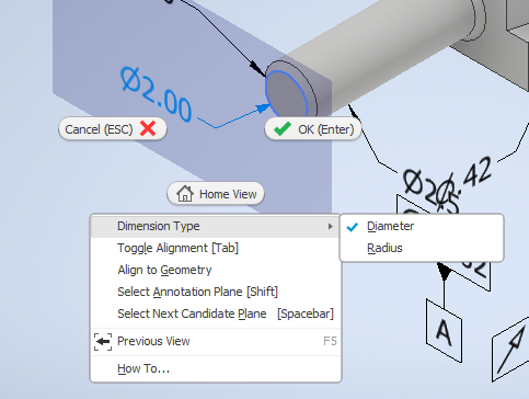 When creating or editing 3D annotations, you can change a diameter dimension to a radius dimension or a radius dimension to a diameter dimension. You can select multiple dimensions of the same type and change them in one action.