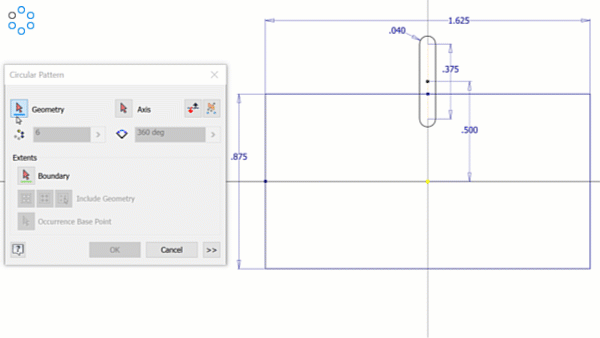 You can now use a sketched boundary and pattern sketch geometry only within that boundary. You determine which geometry is used in the pattern, such as only within the boundary, all with centroids inside the boundary, or by using a base point where all geometry with base points inside the boundary are used.