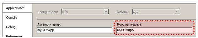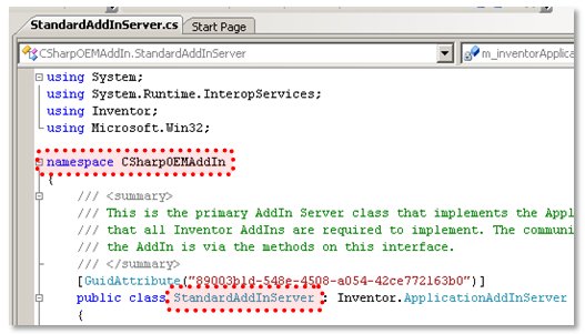 The second part is the namespace that the COM class is defined within. For this example is it MyOEMApp and is highlighted below. The Last piece is the name of the class that implements the ApplicationAddInServer interface, which is “StandardAddInServer” in this example and is also highlighted below.