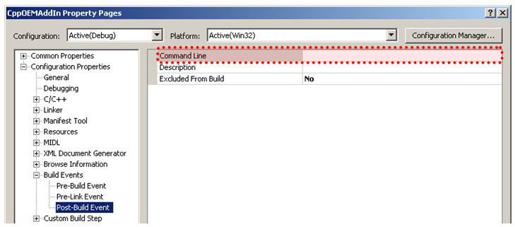 Finally you want to remove the post-build step that registers the add-in in the registry. This is found in the Build Events section of the settings. Clear out any text in the Command Line field, as shown below.