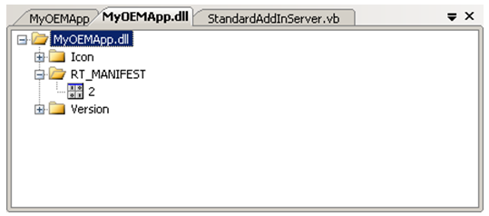You can verify that the manifest has been correctly embedded by dragging the add-in dll into Visual Studio. You should see the “RT_MANIFEST” folder, as shown below. Double clicking on the “2” icon will open a window to show you actual manifest data.