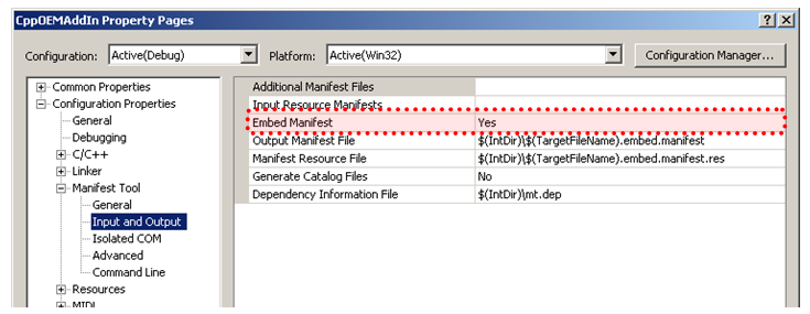 The next step is to configure some project settings so the manifest is correctly embedded within the dll. The first two settings are part of the Linker settings. The settings and the values to change them to are highlighted in the picture below. Some of these settings may already have the correct value.