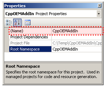The “name” attribute of the clrClass element consists of two parts, separated by periods. The first part is the name of your project. For this example it is CppOEMAddIn. The second part is the name of the class that implements the ApplicationAddInServer interface, which is “CppOEMAddInAddInServer” for this example, as shown below.