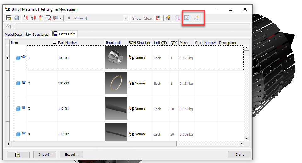 The Bill of Materials dialog has been redesigned. Two options to show or hide items with zero quantity are added directly to the toolbar. Use the new Hide/show rows with zero quantity toggle in the toolbar. When active, you can also renumber the order sequentially using the new Automatic re-numbering sequentially toggle.